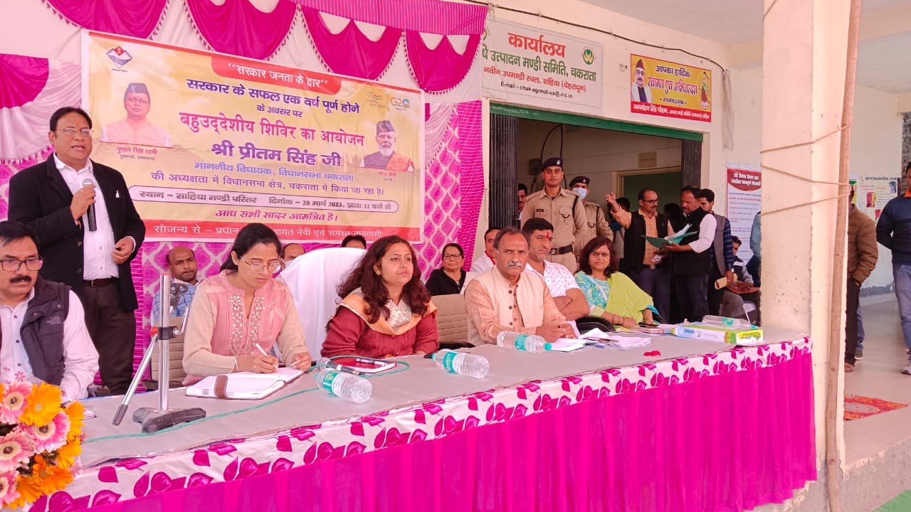 शिविर में चकराता की एसडीएम युक्ता मिश्रा, पंचायत राज अधिकारी विद्या सिंह सोमनाल, पीडब्ल्यूडी के अधिशासी अभियंता (साहिया) प्रत्युष कुमार, सिंचाई विभाग के अधिशासी अभियंता पीएन राय, कालसी की तहसीलदार सुशीला कोठियाल, जिला युवा कल्याण अधिकारी चमन सिंह चौहान, खंड विकास अधिकारी उर्मिला बिष्ट आदि मौजूद रहे।कालसी। राज्य सरकार के एक वर्ष पूर्ण होने पर प्रदेश भर में आयोजित किए जा रहे ‘जन सेवा’ कार्यक्रम के अंतर्गत मंगलवार 28 मार्च को चकराता विधानसभा क्षेत्र में साहिया स्थित कृषि मंडी परिसर में बहुउद्देशीय शिविर आयोजित किया गया। शिविर में बतौर मुख्य अतिथि देहरादून की मुख्य विकास अधिकारी झरना कमठान ने कहा कि शिविर के माध्यम से लोगों की समस्याओं का समाधान करने का प्रयास किया जा रहा है।