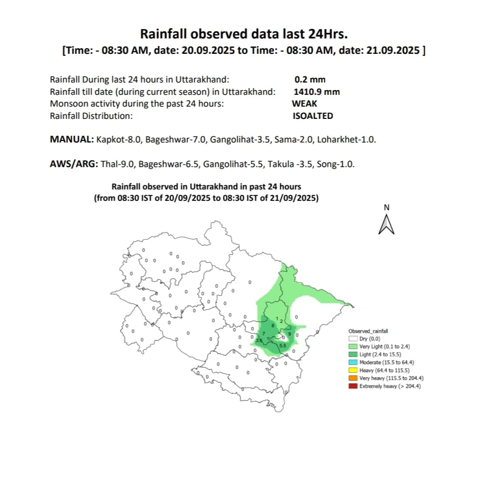 देहरादून स्थित मौसम विज्ञान केंद्र के आंकड़ों के अनुसार, रविवार 21 सितंबर की सुबह 8ः30 बजे तक बीते 24 घंटे में राज्य में सिर्फ 0.2 मिलीमीटर बारिश ट्रेस हुई। बागेश्वर और पिथौरागढ़ को छोड़कर इस अवधि में राज्य के अन्य 11 जिले पूरी तरह सूखे रहे। पिथौरागढ़ के थल में लगे रेन गेज में सर्वाधिक 9 मिलीमीटर और बागेश्वर के सोंग में सबसे कम 1 मिलीमीटर बारिश मिली। जिलों पर नजर दौड़ाएं तो बागेश्वर जिले में 3.6 और पिथौरागढ़ जिले में 0.6 मिलीमीटर बारिश मिली, जो बागेश्वर जिले में सामान्य से क्रमशः 24 फीसद अधिक व पिथौरागढ़ जिले में सामान्य से 91 प्रतिशत कम है। अन्य सभी जिलों में सामान्य के मुकाबले माइनस 100 फीसद की कमी रही।