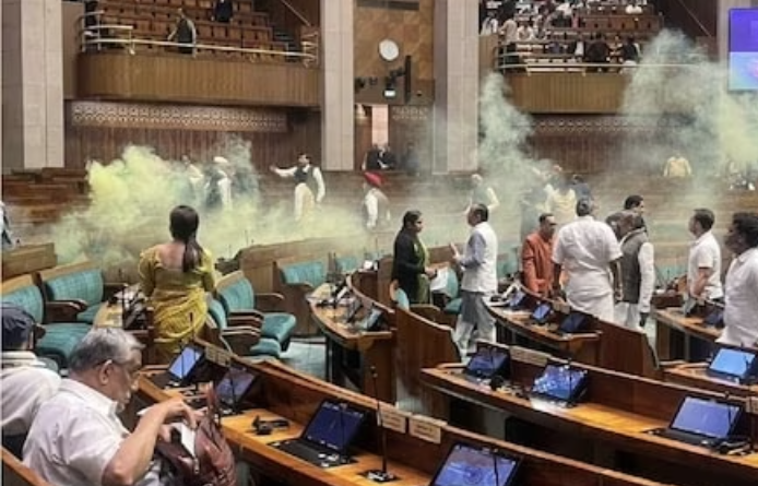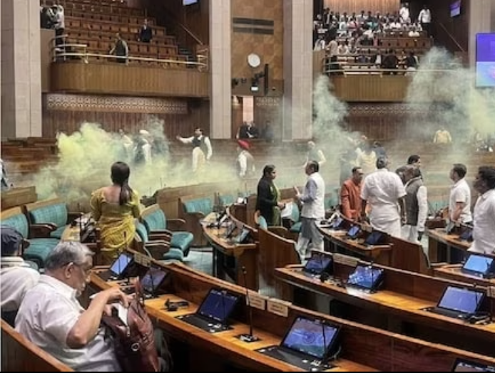 पूर्वाह्न लोकसभा में शून्यकाल की कार्यवाही चल रही थी। स्पीकर के आसन पर राजेंद्र अग्रवाल बैठे थे। भाजपा सांसद खगेन मुर्मू ने अभी बोलना ही शुरू किया था कि अचानक एक युवक दर्शक दीर्घा से सदन में कूद गया। जब तक सांसद कुछ समझ पाते, वह बेंचों पर दौड़ते हुए अध्यक्ष के आसन की ओर बढ़ता है। तभी दर्शक दीर्घा से कूदते हुए उसके दूसरे साथी ने जूते में छिपाकर रखे गए ‘कलर स्मोग क्रैकर’ को नीचे पटक दिया, जिससे सदन में पीला धुंआ फैल गया।