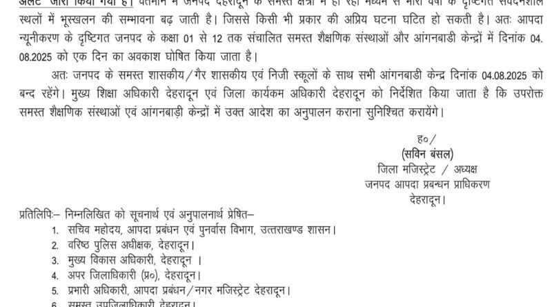 Read Moreदेहरादून। मंगलवार 5 अगस्त को भी देहरादून जिले में के कक्षा 12वीं तक कर सभी स्कूल व आंगनबाड़ी केंद्रों में