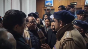 सूचना मिलते ही एसएसपी अजय सिंह समेत कई अधिकारी और पुलिसबल मौके पर पहुंचे। पुलिस ने धरना-प्रदर्शन कर रहे कांग्रेस नेताओं और कार्यकर्ताओं को डीजीपी ऑफिस से बाहर करने का प्रयास किया, जिसे लेकर बहसबाजी हो गई। पुलिस ने कुछ कार्यकर्ताओं को जबरन पुलिस मुख्यालय के गेट के बाहर कर दिया। इस बीच, नेता प्रतिपक्ष यशपाल आर्य, विधायक भुवन कापड़ी समेत कई अन्य नेता भी मौके पर पहुंच गए। आर्य व अन्य नेताओं की एसएसपी से इस मुद्देल पर काफी बहसबाजी हुई। कांग्रेस नेताओं का आरोप था कि पुलिस अधिकारी सरकार व भाजपा के इशारे पर मनमानी कर रहे हैं। रात परमिशन आने के बाद ही पुलिस मुख्यालय के बाहर सड़क पर ही चल रहा कांग्रेसियों का धरना-प्रदर्शन खत्म हुआ।