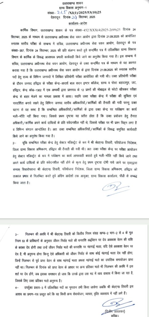 मुख्य सचिव की घोषणा के अनुरूप शासन ने हरिद्वार के बहादुरपुर जट स्थित आदर्श बाल सदन इंटर कॉलेज में बनाए गए परीक्षा केंद्र के लिए सेक्टर मजिस्ट्रेट के रूप में तैनात किए गए जिला ग्राम्य विकास अभिकरण (हरिद्वार) के परियोजना निदेशक केएन तिवारी को सस्पेंड कर दिया है। पेपर लीक कांड के सामने आने के बाद यह पहली बड़ी प्रशासनिक कार्रवाई है। सचिव दिलीप जावलकर की ओर से जारी निलंबन आदेश में कहा गया है कि बतौर सेक्टर मजिस्ट्रेट पर्यवेक्षण कार्य में लापरवाही बरतने और अपने दायित्वों के प्रति संवेदनशील न होने का दोषी बताया गया है। अधीनस्थ सेवा चयन आयोग की ओर से सेक्टर मजिस्ट्रेट के खिलाफ कार्रवाई की संस्तुति की गई थी। निलंबन अवधि में तिवारी पौड़ी स्थित ग्राम्य विकास आयुक्त कार्यालय से संबद्ध रहेंगे।