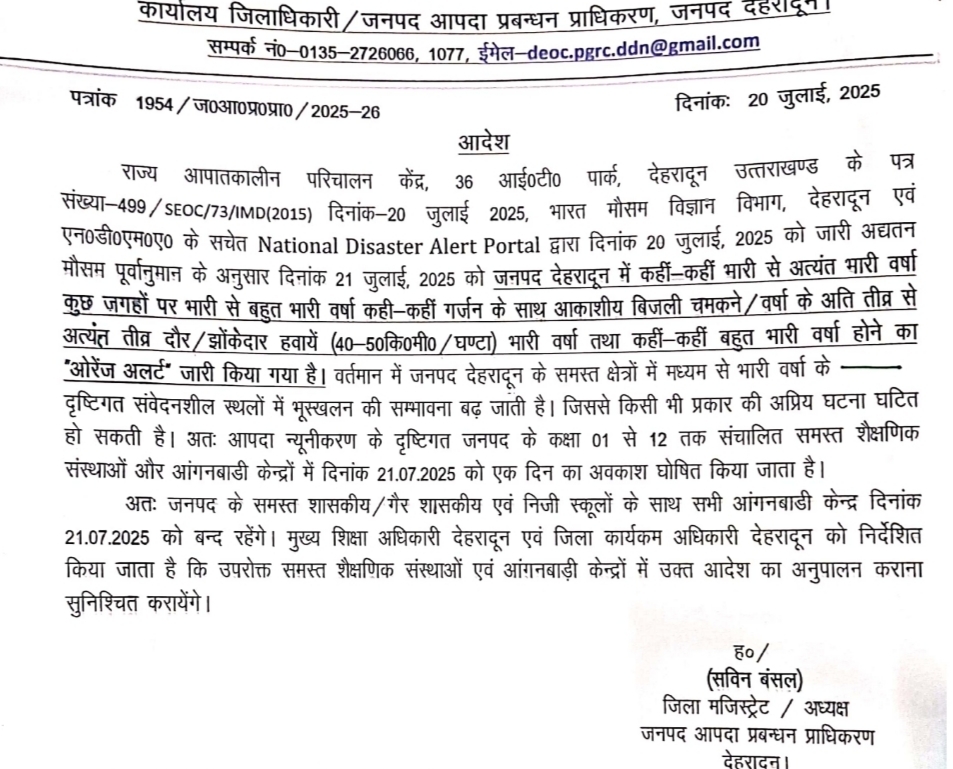 देहरादून। मौसम विभाग के भारी से बहुत भारी बारिश के पूर्वानुमान और एनडीएमए के अलर्ट को देखते हुए देहरादून के डीएम सविन बंसल ने 21 जुलाई को जिले मे सभी सरकारी व निज़ी स्कूलों और आंगनबाड़ी केंद्र मे अवकाश घोषित किया है। डीएम के आदेश के बाद जिले के मुख्य शिक्षा अधिकारी वीके ढौडियाल ने अलग से भी आदेश जारी कर दिया है।