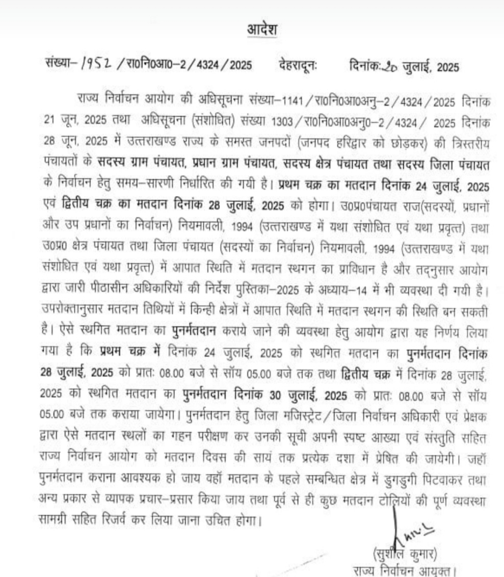 राज्य निर्वाचन आयुक्त सुशील कुमार की ओर से सभी जिला निर्वाचन अधिकारियों को जारी आदेश में कहा गया है कि हरिद्वार को छोड़कर राज्य के सभी जिलों में त्रिस्तरीय पंचायतों के सदस्य ग्राम पंचायत, प्रधान ग्राम पंचायत, सदस्य क्षेत्र पंचायत व सदस्य जिला पंचायत के निर्वाचन के लिए समय-सारणी निर्धारित की गई है। प्रथम चक्र का मतदान 24 जुलाई और द्वितीय चक्र का मतदान 28 जुलाई को होगा। उप्र पंचायत राज (सदस्यों, प्रधानों और उप प्रधानों का निर्वाचन) नियमावली-1994 (उत्तराखंड में यथा संशोधित एवं यथा प्रवृत्त) और उप्र क्षेत्र पंचायत व जिला पंचायत (सदस्यों का निर्वाचन) नियमावली-1994 (उत्तराखंड में यथा संशोधित एवं यथा प्रवृत्त) में आपात स्थिति में मतदान स्थगन का प्रावधान है। इसी के अनुसार आयोग की ओर से जारी पीठासीन अधिकारियों की निर्देश पुस्तिका-2025 के अध्याय-14 में भी व्यवस्था दी गई है।