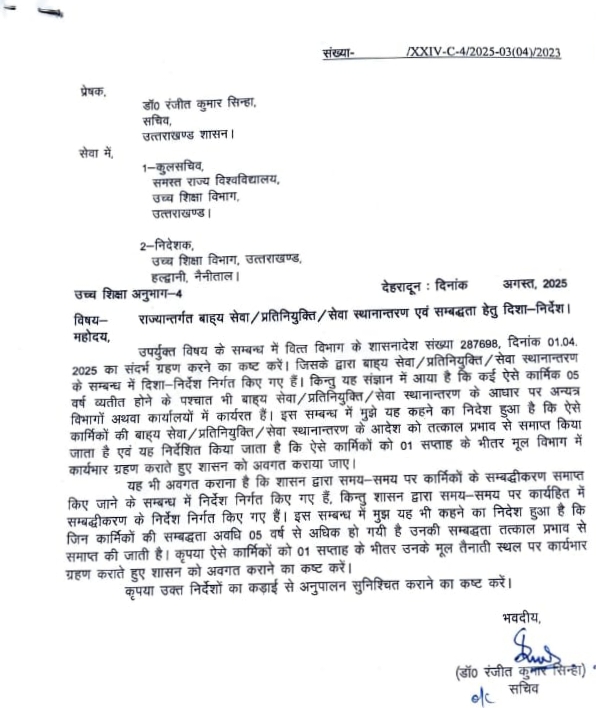 उच्च शिक्षा सचिव की ओर से जारी आदेशों में कहा गया है कि वित्त विभाग के 1 अप्रैल 2025 के शासनादेश से बाह्य सेवा या प्रतिनियुक्ति अथवा सेवा स्थानांतरण के संबंध में दिशा-निर्देश दिए गए हैं। इसके बावजूद कई ऐसे कार्मिक हैं, जो 5 वर्ष व्यतीत होने के बाद भी बाह्य सेवा या प्रतिनियुक्ति अथवा सेवा स्थानांतरण के आधार पर अन्यत्र विभागों या कार्यालयों में कार्यरत हैं। ऐसे सभी कार्मिकों की बाह्य सेवा/प्रतिनियुक्ति/सेवा स्थानांतरण को समाप्त करते हुए सचिव ने उन्हें एक सप्ताह के भीतर उनके मूल विभाग में कार्यभार ग्रहण कराते हुए शासन को अवगत कराने के लिए कहा है।